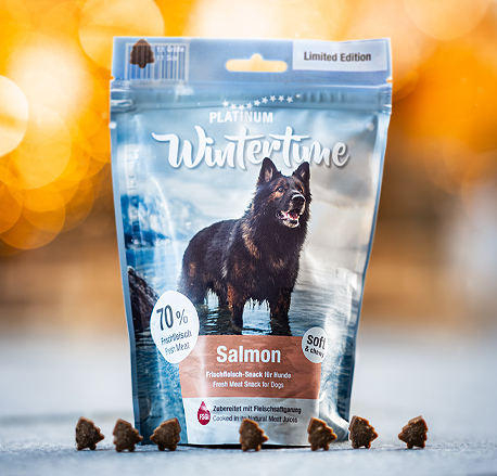 Šunelių kaip visuomet laukia ypatingai skani dovana riboto leidimo PLATINUM Wintertime skanėstai pagaminti iš šviežios lašišos ir paruošti unikaliu FSG (Fleischsaftgarung) gaminimo būdu. Šie skanėstai yra sultingi, minkšti ir lengvai virškinami. Pradžiuginkite savo keturkojį šventiniu laikotarpiu ir pasirūpink Wintertime skanėstais jai dabar!
